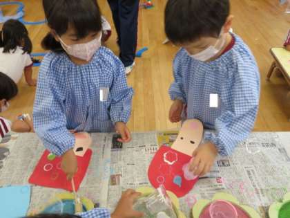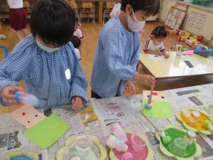 4歳児ほし組では、画用紙でつくったキノコの帽子にスタンピングで模様をつけました。プリンカップやヤクルト容器など身近な素材も使ってスタンピングを楽しみました。「お花の形みたい!」「丸いっぱいにした!」など、いろいろな色や形を選んで模様をつけることを楽しんでいました。完成したキノコは夏休み明けに壁面としてみんなを出迎えてくれる予定です。楽しみにしていてね♪