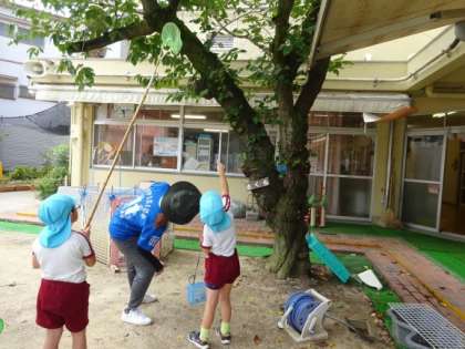 セミみーつけた! 公開日 2022/07/22 更新日 2022/07/22 保育の様子 預かり保育の子どもたちは虫かごと網を手に取り、桜の木を見上げていました。「セミどこにいるかなあ」と虫探しに夢中です。「いた!見て!」と見つけたセミを自慢げに見せてくれました。セミが羽を広げると、子どもたちは「わあーっ」と声を上げてびっくりしていました。身近にいる虫に興味をもち、季節の遊びを存分に楽しんでほしいと思います。 いいね(0)