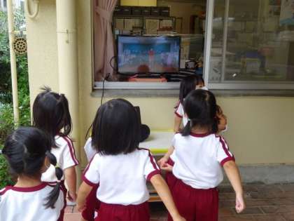 子どもたちはダンスが好きで、好きな曲をかけて踊っています。何度も何度も繰り返し踊ることで、振りを覚えたり、創作したりしながら楽しんでいます。日頃の子どもたちの様子から、職員は自分たちが踊っている動画を撮影し、テレビに映すことにしました。これが子どもたちに大好評で、テレビの前で楽しそうに踊っていました。少しの工夫で、普段の遊びがさらに楽しいものになっていきます。職員でアイデアを出し合いながら、教材研究に取り組んでいきたいと思います。保護者の方も是非ご覧いただき、お子さんと一緒に踊ってみてくださいね。