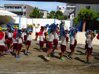 全園児での集会では、キラキラポンポンを持って踊りました。太陽の光があたると「キラキラ!」と言い、ポンポンを振って見せてくれました。ダンスも一つ小道具が入ることで「やってみたいな」「楽しいな」と、より感じることができますね。体を動かして遊ぶことを楽しめるように、遊具や用具を使って遊ぶ活動も積極的に取り入れていきたいと思います。