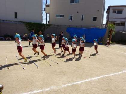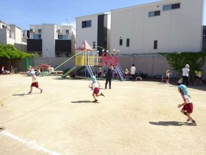 5歳児は、1学期から継続して縄で遊んできました。長縄の通り抜けも最初は怖いと感じていた子どもも、友達と一緒に通り抜けたり、励ましてもらったりすることで前向きに取り組んでいます。「絶対いけるって!」と肩をポンポンとしながら励ます姿は、見ていて心があたたかくなります。クラスでの活動を通して一体感や、友達とのつながりの大切さを感じてくれるとうれしいです。