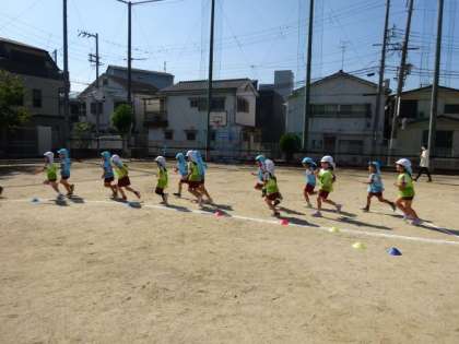 5歳児は今日もリレー遊びをしました。毎日取り組む中で、子どもたちの心にも変化が出てきました。早く走れる方法を考える、こけてもすぐに立って走るなど、一人ひとりがリレー遊びに対して意欲的になっています。走っているときも「がんばれー!」と応援しあい、見ている職員も「みんながんばれー!」と力が入ります。リレー遊びは子どもの心の育ちが数多く見られます。一人ひとりが互いの良さを認めあえるように、働きかけながら遊んでいきたいと思います。