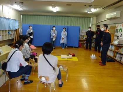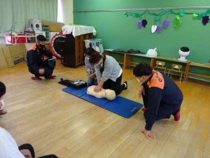本園のPTA活動として、救命講習会を実施しました。消防士の方にAEDの使用方法や、呼びかけの仕方などを教えていただきました。参加された保護者の方は熱心に受講されていて、終了後は「勉強になりました!」と言われていました。いつ何が起こるかわからない状況の中で、手立てを知っておくことが救いの一手となることもあります。ご家庭でも救急時のことを考える機会になるといいですね。