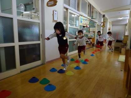 今日は一日雨でしたが、4歳児は廊下も利用して遊んでいました。コーンを置くと、サッカー選手のように8の字に走ったり、ジャンプをしたりしていました。雨の日はなかなか体を動かして遊ぶことが難しいですが、安全面に留意しながら園内を工夫し環境を整えていきたいと思います。