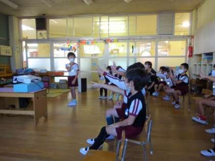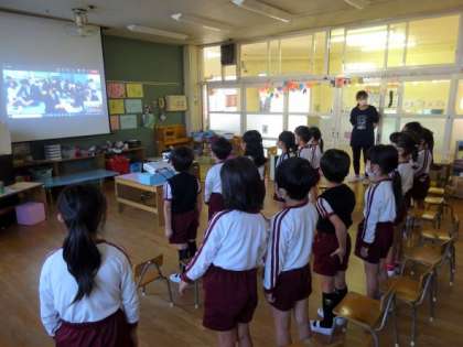 西淀中学校の生徒と5歳児が、オンラインで交流をしました。画面に映った生徒を見て、5歳児は大喜びで手を振っていました。手遊びやジャンケンをしたり、生徒がクイズをしてくれたりと、楽しい交流となりました。同じ地域に住む人に親しみをもつ機会を大切にしていきたいと思います。次回は3歳児、4歳児との交流ですよ。楽しみですね。