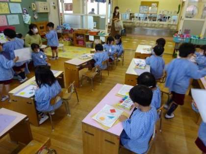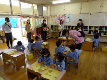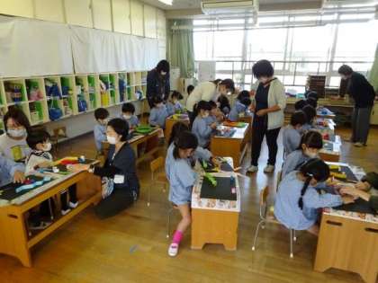 今日から参観ウィークが始まりました。作品展が11月下旬にあるので、今回はつくったりかいたりする遊びを中心に参観していただくことにしました。素材や色などを自分で選び取り組む中で「こんなんできてきた!」など口々に楽しさや面白さも表現していました。いろいろな素材に触れながら、様々な方法で表現することを楽しめるように環境を整えていきたいと思います。ご参加いただきました保護者の皆様、ありがとうございました。
