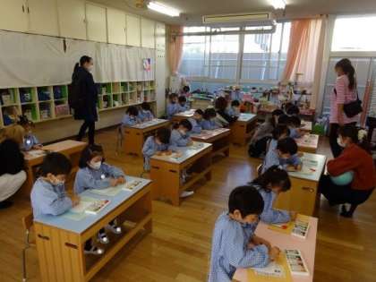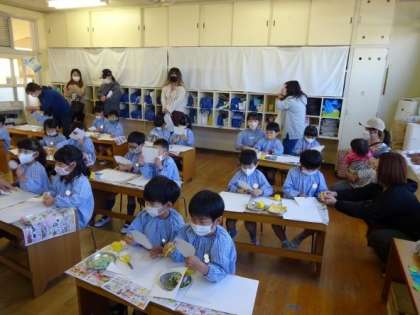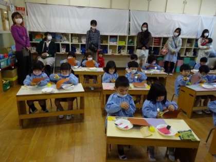 感染症対策として、保護者の皆様には分散でご来園いただいております。ご協力ありがとうございます。今日はハサミやクレパス、糊を使った取り組みをしました。好きな色を選んだり、形を考えて切ったりしながらつくっていました。同じ題材でも、一人ひとりイメージが違うので、同じものが出来上がることはありません。互いに違いを認めあうことで、それぞれの良さを感じてくれるとうれしいです。明日は参観ウィーク最終日です。明日もよろしくお願いします。