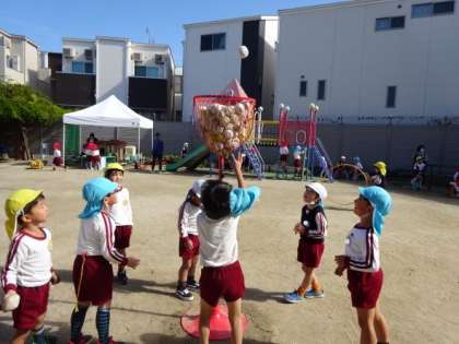 玉入れが楽しいようで、何度も繰り返し遊んでいます。玉がカゴの中に上手く入るようになってきたことが嬉しいようです。今日は玉を全部入れようと言い、みんなで応援しながら遊んでいました。遊びを通して一体感を感じ、友達とのつながりの大切さに気付くことができるよう、職員も一緒に楽しんでいきたいと思います。