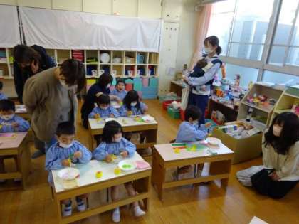 3日間に分散し、参観ウィークを実施しました。最終日は木の実やすすきなどを飾ったり、折り紙を切って紙皿に貼ったりして遊びました。自然物に触れる機会をもつことで、秋の季節を感じてほしいと思い職員は環境を整えていました。近くの公園や河川敷でもたくさんの実りの秋が見られると思いますので、是非見ていただきたいと思います。保護者の皆様、参観ウィークへのご協力、本当にありがとうございました。