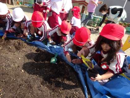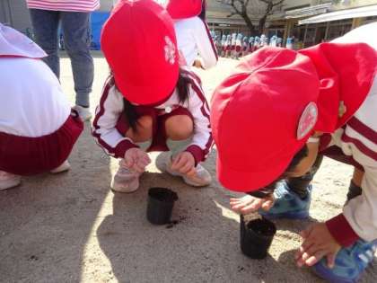 3歳児が種を蒔きました。種を見て「ちっちゃい!」と言い、何度も種を覗き込んで見ていました。苗や球根をこれまでも植えた経験から、ポットに土を入れるのも上手です。小さな種をもらうと、やさしく土に蒔いていました。種から野菜の育ちを見て感じることができる経験を大事にしていきたいと思います。今日蒔いた種は、鍋に入れても最高!サラダも最高です。芽が出てきた頃に答えと様子をお伝えしたいと思います。お楽しみに。