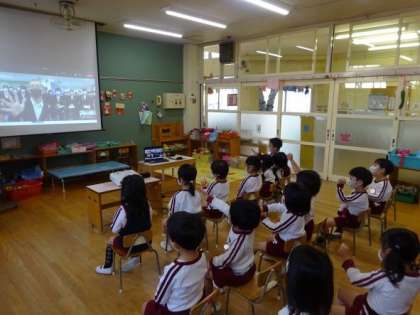 西淀中学校との交流最終日は、3歳児が手遊びやジャンケンを一緒にしました。「何組ですか?」などの質問にも答えてもらうことで、やりとりを喜んでいました。実際に幼稚園に来てかかわることが難しい中ではありますが、今できることを互いに考えて取り組むことができたことを嬉しく思います。今後も学校間連携を密にすることで、子どもたちの経験を大切にしていきたいと思います。西淀中学校のみなさん、ありがとうございました。