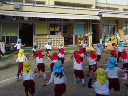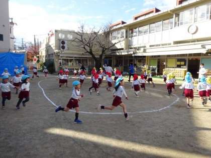 12月になり寒さを感じるようになってきました。怪我防止の願いも含め体をあたためてから遊ぶことができるよう、マラソンを始めました。走る前には5歳児が先生となり、ダンスやストレッチを教えてくれました。マラソンは曲がなり終わるまで走り続けることにしましたが、全園児喜んで参加しています。体を動かすことで体がポカポカあたたかくなることも感じてくれるとうれしいです。