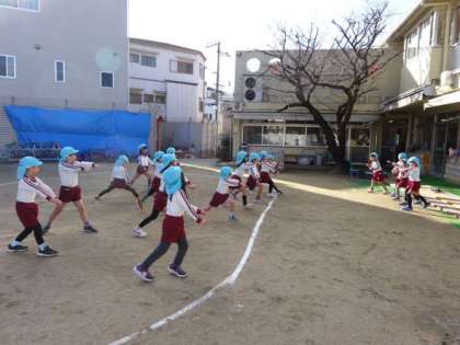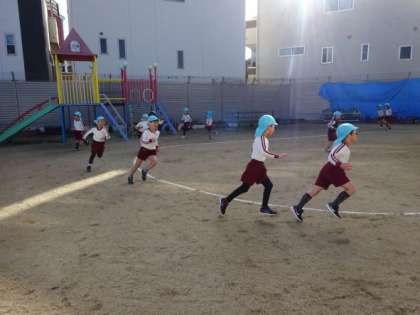 5歳児はマラソンを始める前にダンスや体操をしています。体操は当番の子どもたちが決めて行います。「手をグルグル回します!」「次は足を伸ばすよ」など自分たちで考えて取り組むことで、マラソンも意欲的になってきました。マラソン後はなわとびタイムを実施し、目標をもって取り組む姿があります。いろいろな方法を取り入れながら、体を動かす楽しさを感じられるように工夫していきたいと思います。
