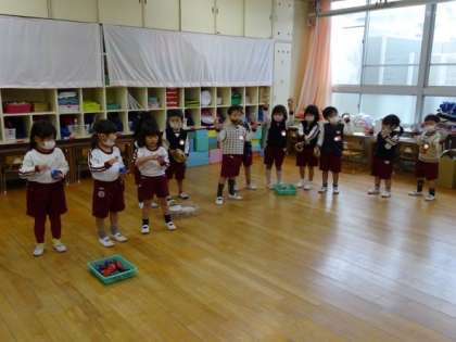 3歳児が耳なじみの曲に合わせて楽器遊びをしました。昨日の誕生会で5歳児が楽器遊びを見せてくれたこともあり、同じようにならしていました。「大きい組さんみたいやね」と伝えるとジャンプをして喜んでいました。園内で見たり聞いたりする機会を大切にすることで興味をもち、自分もしてみたいと思う気持ちを育んでいきたいと思います。