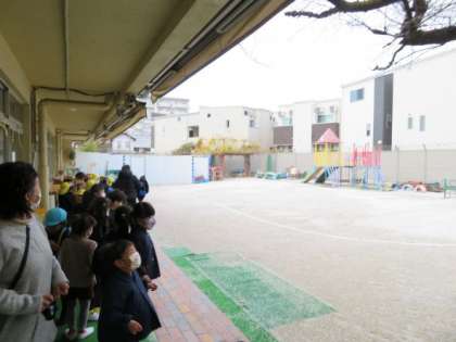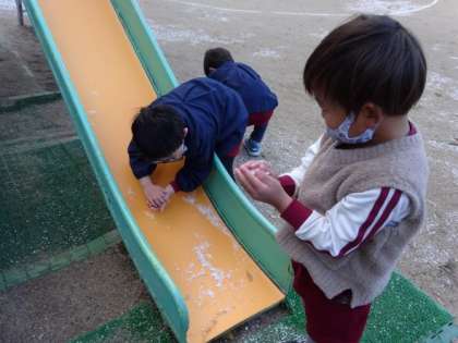 登園時間に空から雪が降ってきました。子どもたちは「雪いっぱい!」と大喜びでした。時間とともに雪は本降りとなり、子どもたちがテラスに集まってきました。「すごい!お庭白くなってきた!」と園庭で雪を集めていました。大阪ではなかなか雪を見る機会が少ないので自然現象に興味がもてる嬉しい経験となりました。