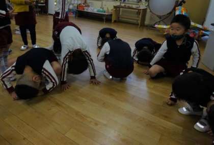 4歳児は絵本の登場物になって遊ぶことを楽しんでいます。今日は大きなたまごになって遊びました。たまごといっても、表現の仕方はひとつではありません。体を丸める子ども、膝を伸ばしてたまごになる子どもなど様々で、見ていてとても面白いです。子どもの豊かな感性や、一人一人の表現を大切にしていきたいと思います。