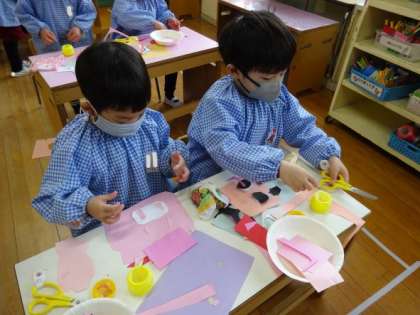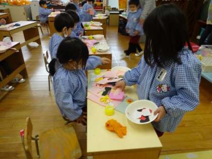 3歳児はブタが出てくるお話が好きで、かわいいブタになって遊ぶことを楽しんでいることから、ブタをつくることにしました。それぞれにどのブタをつくろうかと考えながらつくっていました。できあがると「こんなのできた!見て!」ととても嬉しそうな表情を見せてくれました。子どもたちの表現方法は様々で、言葉や動きだけでなく、つくったりかいたりする活動の中でも思いが伝わります。保育室にかわいいブタがいっぱいいますので見てください。片付けも丁寧にできるようになってきました。