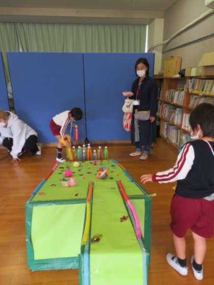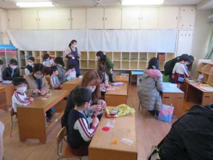 5歳児と保護者のお別れ会をしました。子どもたちは好きな色のカバンをもらい、いろいろな遊びのブースをお家の方と一緒に楽しみました。ボール転がしやお買い物コーナー、魚釣りや粘土でアクセサリーをつくるコーナーなど、楽しい時間を過ごしていました。他の学年の保護者の方にもお手伝いいただきました。分散できるよう安全面に配慮したブースの配置等も考えてくださり、本当にありがとうございました。