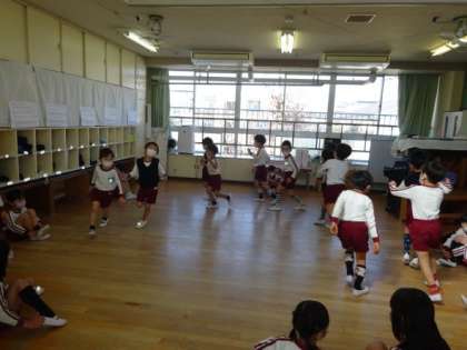 5歳児はリズム遊びを楽しみました。この遊びは年間を通して楽しんできたものです。スキップをしたり、ふれあい遊びをしたりと本当に楽しそうでした。友達の姿を見て応援したり拍手をしたりする姿に成長を感じます。たくさんの友達と一緒に遊ぶことができる喜びを大切にしてほしいと思います。