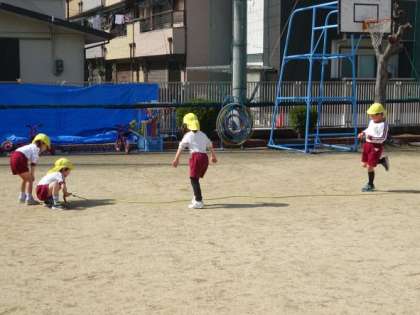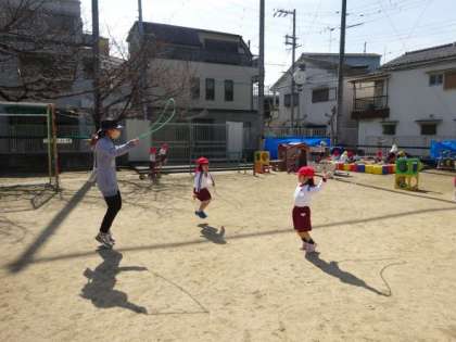 第2グラウンドで遊びました。長縄を友達と交代しながら回したり、短縄を繰り返し楽しんだりしていました。年間を通して友達とのかかわりが深まり、遊びも広がってきたように思います。幼稚園でたくさんの友達と遊ぶ楽しさを感じることができるよう、遊びの環境を充実させていきたいと思います。