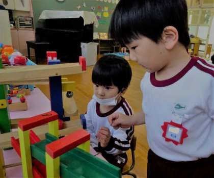 3歳児にとって初めての園生活がスタートしました。今日は保育室で好きな遊びを楽しみました。ままごとやブロック、電車などご家庭で遊ばれている物があることで、安心して遊ぶことができる環境を整えています。少しずつ園生活に慣れてくれるとうれしいです。また明日もたくさん遊びましょう。