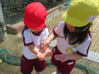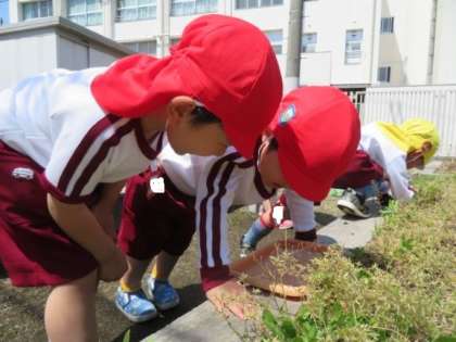 第2グラウンドにもよーく見るとたくさんの生き物が住んでいます。ダンゴムシが歩いたり丸まったりする姿をじっと見ることを楽しんでいた3歳児の子どもたち。すると4歳児が「こっちにもおるで」とダンゴムシの居場所を教えてくれたり、「触ってみる?」と優しく聞き、手の上にのせてくれたりしました。「これはお父さん」「これは赤ちゃん」とダンゴムシを見て感じたことや思ったことを思い思いに伝え合い、ダンゴムシ探しを楽しんでいました。
