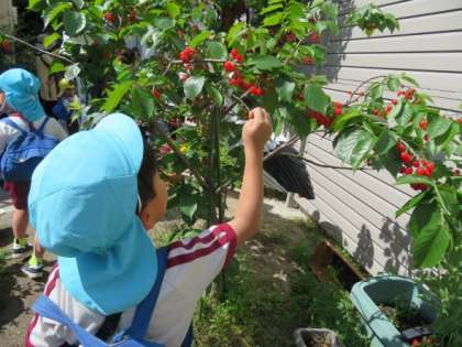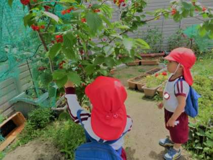 本園90周年で植樹していただいたサクラの木に、赤く色づいたサクランボがたくさん実りました。「サクランボいっぱい!」「おいしそう」と子どもたちはサクランボを見たり触ったりしていました。身近な自然物にふれることで季節を感じることができますね。年間を通して草花や野菜など季節を大切に考えた保育を展開していきたいと思います。