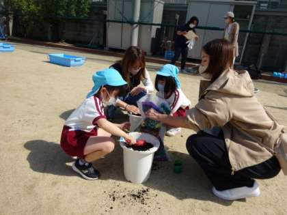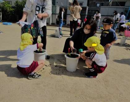 保護者の方と一緒に夏野菜を植えました。「トマトいっぱいできるかな」と期待をもつ姿もありました。ミニトマトやピーマンなど、できたものはスーパーなどで目にすることもあるかと思いますが、苗から育てることで実ができるまでの過程を大切にしたいです。何色の花が咲き、どのように実がなるのかを知ることで、食べ物の興味や関心につなげていきたいと思います。