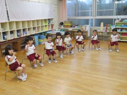 はな組には、絵本を通して、歯みがきをすると口の中がきれいになり、気持ち良くなることを知らせました。指導後、みんなで歯みがきをし、歯ブラシを列車に見立ててすると楽しくできました♪