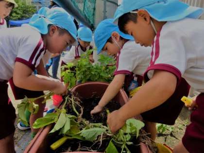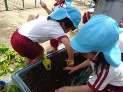 5歳児が4歳児の時に植えたジャガイモを掘りました。スコップや手で土を掘っていくと「見て!おいもや!」「こっちもある!」と大喜びでした。ひいて抜くと根に芋がたくさんついていて「なかよしおいもやな」と子どもたちのかわいい表現に癒されました。スーパーでは袋に入った状態で売られているので、栽培し収穫することでどのようにつくられているかを知る機会となればうれしいです。幼稚園の環境も季節に合わせて整えていきたいと思います。
