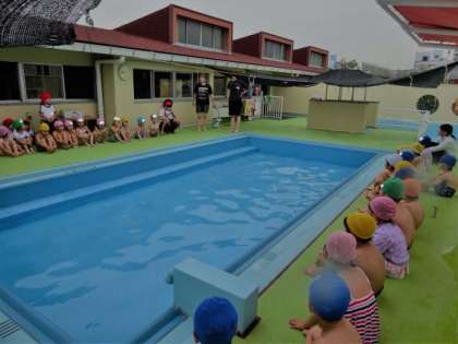 子どもたちが楽しみにしているプール遊びが始まりました。水に入ると「キャーッ!」と言い大喜びでした。水の感触を存分に感じながら、水と仲良くなってくれるとうれしいです。明日からのプール遊びも楽しみですね。