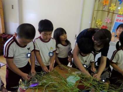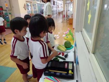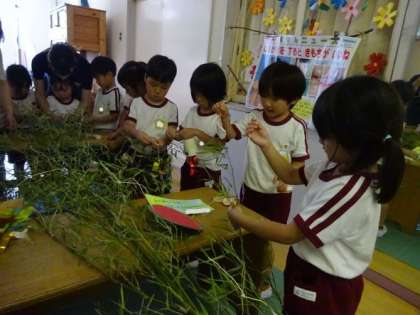 それぞれに願いを込めた短冊や飾りを、大笹に飾ることにしました。クラスごとで飾りも違い、とても賑やかになりました。伝統文化に親しむ機会を大切にすることで関心をもつ機会としていきたいと思います。