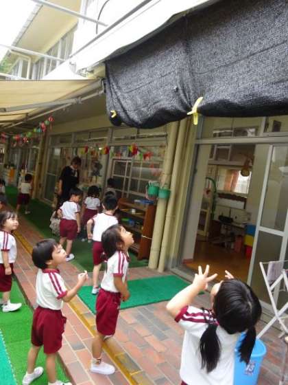 4歳児は生き物にとても関心が強く、毎日虫カゴを見つめています。サナギからチョウチョウになるとみんなで空に放していました。今日も「バイバーイ!」と空に放したのですが、子どもたちの手や近くの物にとまり、なかなか飛んでいきませんでした。「おーい!だいじょうぶ?」と手を振り見守っていると無事空に飛んでいくことができました。身近な生き物に愛着をもち大切に想う気持ちを大切にしていきたいと思います。