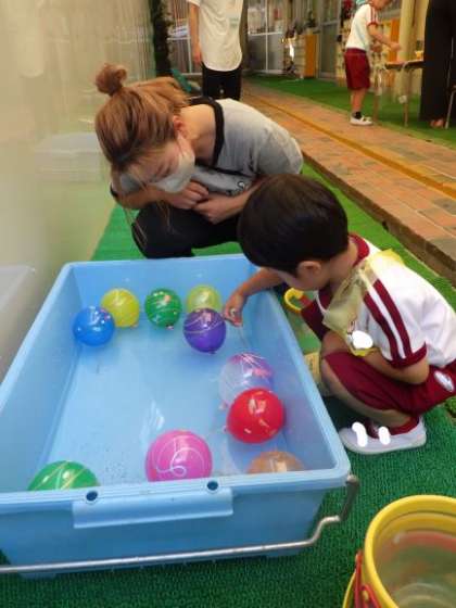 輪投げやコイン落とし、ヨーヨー釣り、アイスクリーム屋さんなど楽しいお店がたくさんあり子どもたちは好きなお店を回って遊びました。そら組もお店を出してくれました。