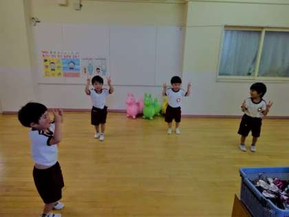 3歳児はカニやエビが出てくるダンスが好きで、自分たちで曲を流して踊ることを楽しんでいます。大好きな友達と一緒に踊る嬉しさや、曲に合わせて体を動かす楽しさを感じることができるよう、子どもたちの興味に合わせて教材を工夫していきたいと思います。