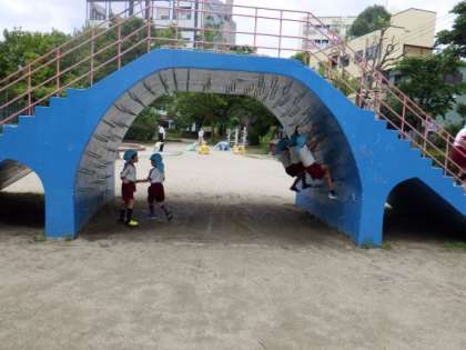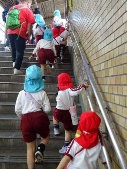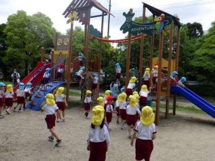 1学期に園外保育で電車に乗り、大きな公園へ出かけました。新入園児にとっては初めての園外保育でしたが、長い階段も一生懸命登っていました。電車の中や公園内もマナーについてもみんなで考えました。大きな公園でのびのびと遊んで楽しい1日でしたね。