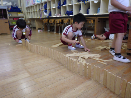 4歳児は、カプラという木の積み木を並べたり、重ねたり、いろいろな工夫をしていました。