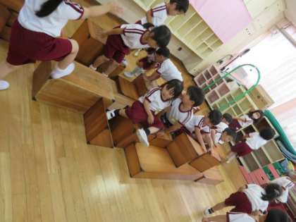 4歳児は、大型積み木で遊びながら「船だよ!」「こっちに魚がいるぞ!」と友達とイメージの共有をして楽しみました。