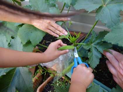 預かり保育に参加している子どもたちがオクラを収穫しました。スーパーでは袋に入って売られていることが多いですよね。オクラがどのようにできるのか実際に育てることでわかることもたくさんあり、収穫時には「チクチクする」と話していました。体験することで気付きや学びも増えていきます。園の環境を整えながら実体験を大切に考え保育をすすめていきたいと思います。