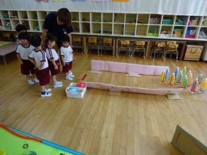 3歳児は、はじめての夏祭りに参加しました。先生と一緒に順番に並んで、いろいろなお祭り遊びを楽しみました。