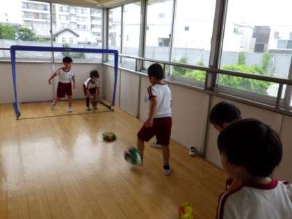 5歳児はルールのある遊びをたくさん楽しんでいました。サッカーでは、自分達で決めたルールを考えながら、取り組んでいました。