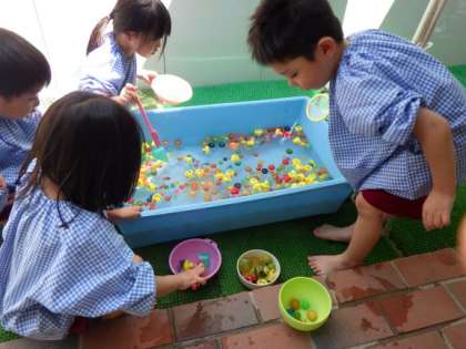 4歳児は、スーパーボールすくいを楽しみました。友達と一緒に数を数えたり、微妙に違うスーパーボールの形に気が付き、同じ形を集めたりする子どももいました。