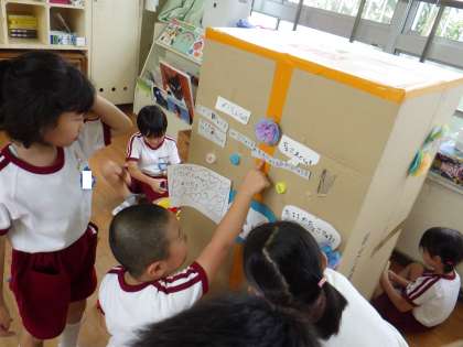 5歳児は、夏祭りに向けて自動販売機を作っていました。ボタンの形や、売りたい飲み物の文字を、友達と相談しながらかいたりつくったりして楽しみました。