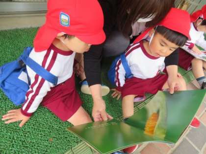 3歳児は、お気に入りの虫の絵本を先生や友達と一緒に見ながら、「てんとうむしだ」「かわいいね」と素直に思いを言葉にしていました。