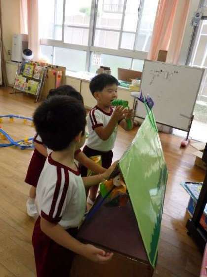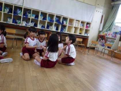 5歳児は、活動の中で子どもたちが話し合う場面がありました。自分の思いが相手に伝わり、相手の思いが分かる喜びを味わうことは簡単なことではありませんが、いろいろな活動で取り組んでいます。