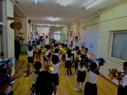 子どもたちが廊下でダンスを踊りました。キラキラポンポンを持ち、笑顔いっぱいで踊っている姿からは、この暑さにも負けないパワーを感じました。子どもたちの興味に沿った音楽や遊びを2学期からも取り入れ、丁寧に保育をすすめていきたいと思います。
