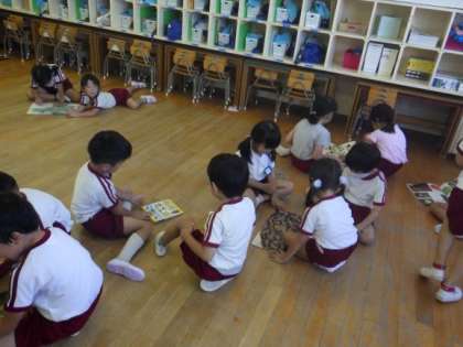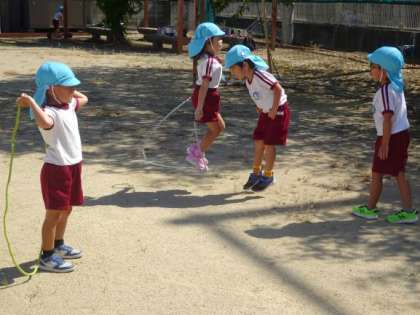 毎日暑い日が続いていますが、体を動かして遊んでいます。にこにこの部屋で縄遊びをしました。2人組になって2人跳びに挑戦です!2人でタイミングを合わせて跳ぶにはどうすればいいだろう?友達と考えながら何度も跳んでいました。今日は朝の少し涼しい時間にグラウンドで遊びました。「今日も2人跳びやろう!」「見てて。跳べた!」自分たちなりに目標をもち、それに向かって繰り返し挑戦しようとする姿が見られました。