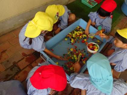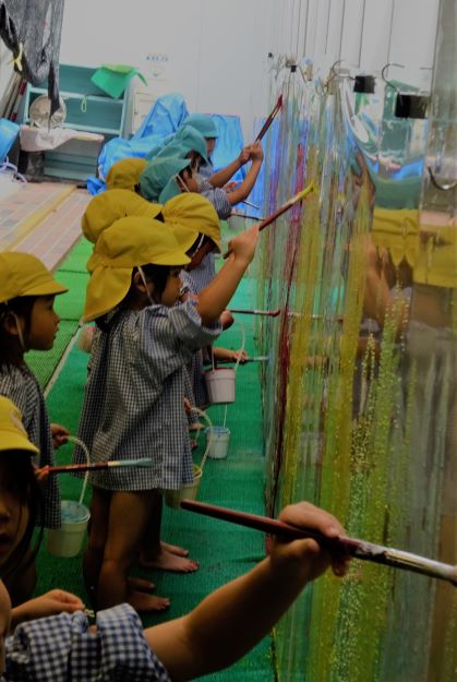 毎日暑い日が続いています。気温が高く戸外で遊ぶことが難しい日も多いことから、水や絵の具などで遊ぶことにしました。工事の壁も活用し、絵の具を使ってかいたり、スーパーボールすくいの中に氷を入れたりと職員の工夫がつまった遊びに、子どもたちも喜んでいました。今ある環境をうまく取り入れながら、幼稚園だからこそできる経験を大切にしていきたいと思います。