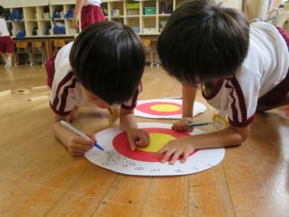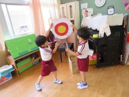 4歳児の子どもたちは、手裏剣遊びを楽しんでいます。今日は手裏剣をあてる的を作るみたいです。