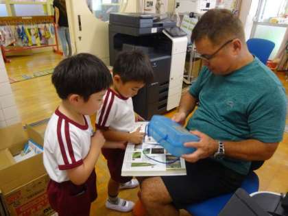 4歳児がグラウンドでバッタを見つけました。虫かごに入れ「みんなに見せるねん」と保育室に持ち帰りました。すると図鑑を抱えた子どもたちが「図鑑で探してるけど名前がわからんねん」と事業担当主事のところへやってきて、一緒に考えていました。幼稚園では担任というくくりはありますが、全教職員で子どもたちとかかわっています。子どもたちが安心できる場を大切にしていきたいです。